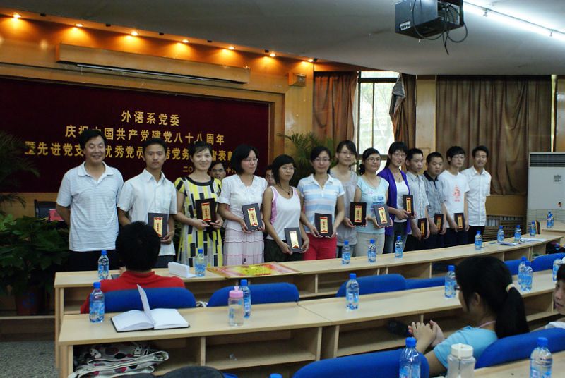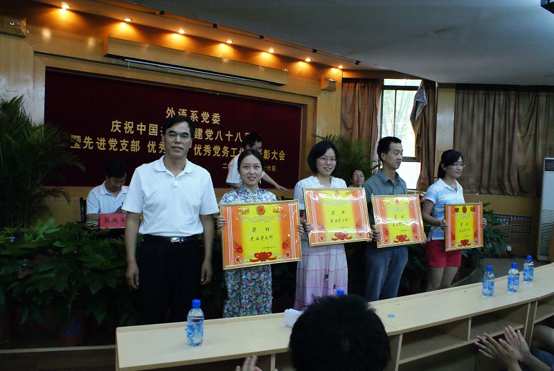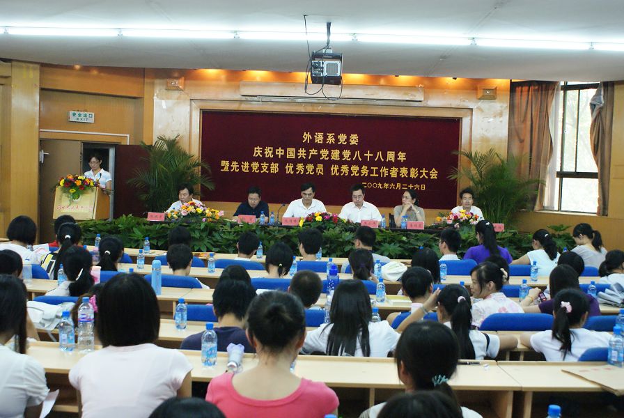 6月26日下午,外语系党委庆祝中国共产党建党八十八周年暨先进党支部、优秀共产党员、优秀党务工作者表彰大会在北校区七号楼二层报告厅隆重举行。系党委委员、各支部书记、教职工党员、员工党员二百余人参加会议。大会由系副主任杨宏同志主持。