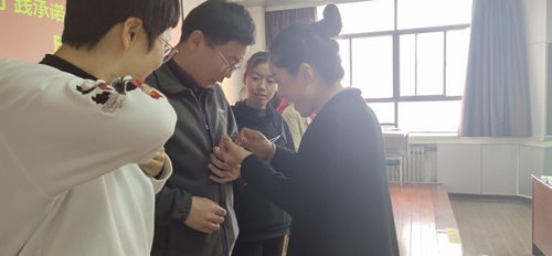 活动伊始,张琦领学了公司《关于开展“亮身份,践承诺,树形象”主题实践活动的通知》,就本次活动的指导思想、意义、内容和要求进行了说明。他指出,第一,全体员工党员要在日常学习、参加活动等过程中全程佩戴党员徽章,主动亮明身份;第二,要主动服务师生,自觉填写党员承诺书,并在微信平台作一句话承诺,自觉接受群众监督;第三,要把党员参与主题实践活动情况与民主评议党员机制相结合,坚守共产党人的精神高地,做到在党言党、在党忧党、在党为党、在党爱党;第四,员工党员要积极参与“学风建设主题月”相关工作,在学风建设中勇当先锋,提升自我约束力,真正做到学风建设党员先行。随后,滕艳萍副书记为外语系员工支部书记、新任支部委员佩戴党员徽章,并叮嘱他们要时刻铭记党员身份,珍惜、完善保存党员徽章。