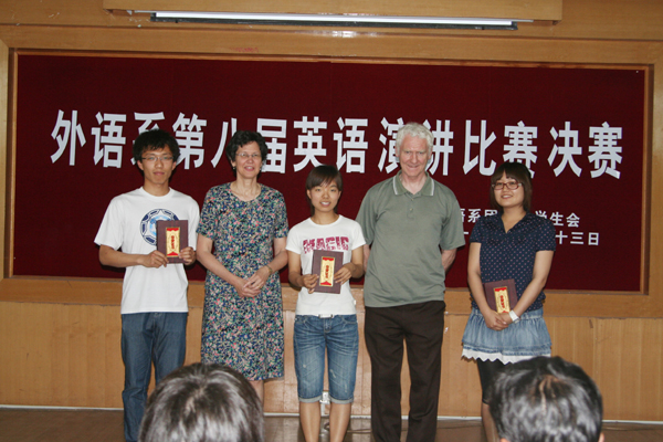 系主任窦琴为一等奖获得者颁奖 系党委书记李安民为优秀组织奖颁奖 系党委书记李安民、副书记王小平为二等奖获得者颁奖 外籍教师Elizabeth、Martin为三等奖获得者颁奖 评委为优秀奖获得者颁奖