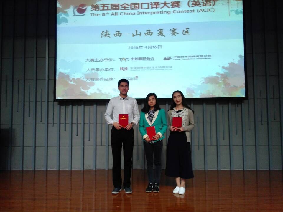 4月16日,由中国翻译协会、中国对外翻译有限公司主办的第五届全国口译大赛(英语)陕西、山西赛区复赛,在西安外国语大学(长安校区)举行。来自陕西、山西两省多所高校的37名员工参加了此次比赛。我系共推荐3名优秀员工参赛,经过激烈的角逐,王乐荣获复赛三等奖,颜欢、秦艺航荣获优秀奖,刘方老师获得优秀指导教师荣誉称号。