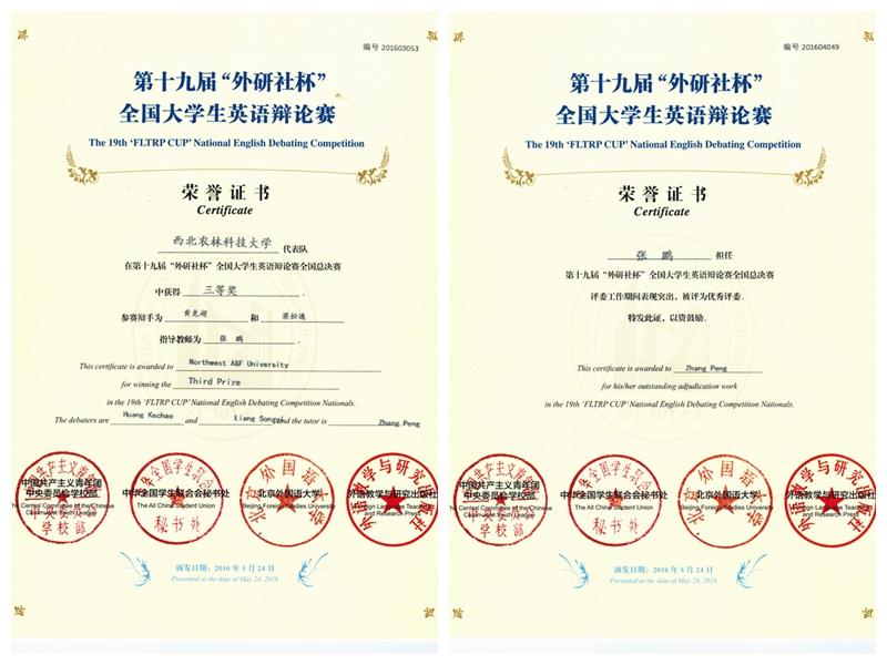本次全国总决赛历时一周,包括赛前培训、思辨研讨会以及循环淘汰赛等一系列赛事活动,为各参赛队伍的辩手和指导老师提供了广阔的交流平台和学习机会。本次比赛的辩题紧跟时代潮流,并具有鲜明的国际视野,充分考验了辩手的知识量与思辨能力。我系两名辩手在张鹏老师的精心指导下,以敏捷的辩论思维和严密的逻辑,认真参与每一场辩论,最终取得全国总决赛三等奖。