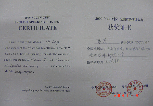 11月5日—7日,由中央电视台和外语教学与研究出版社共同主办的2009 “CCTV”杯全国英语演讲比赛半决赛在北京外国语大学阿语楼隆重举行,来自全国29个省、市、自治区和澳门地区的90名优秀选手参加了比赛。我系葛亮同学以及西北工业大学、西安文理公司的另外两名选手代表我省参加了半决赛。