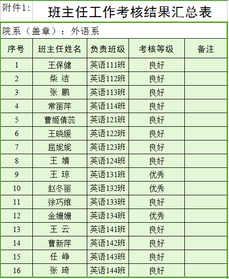 外语系2014-2015学年第一学期班主任工作考核结果
