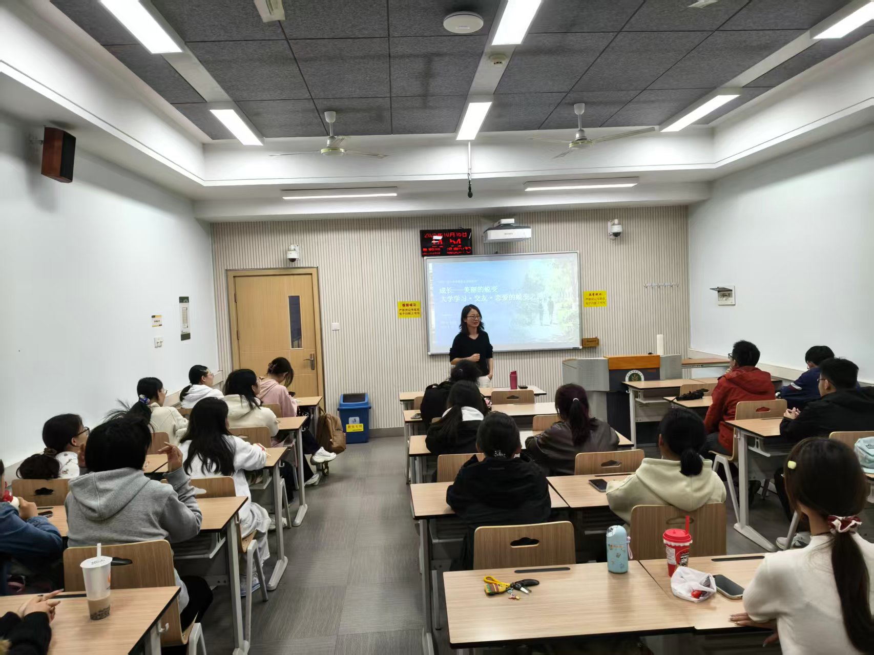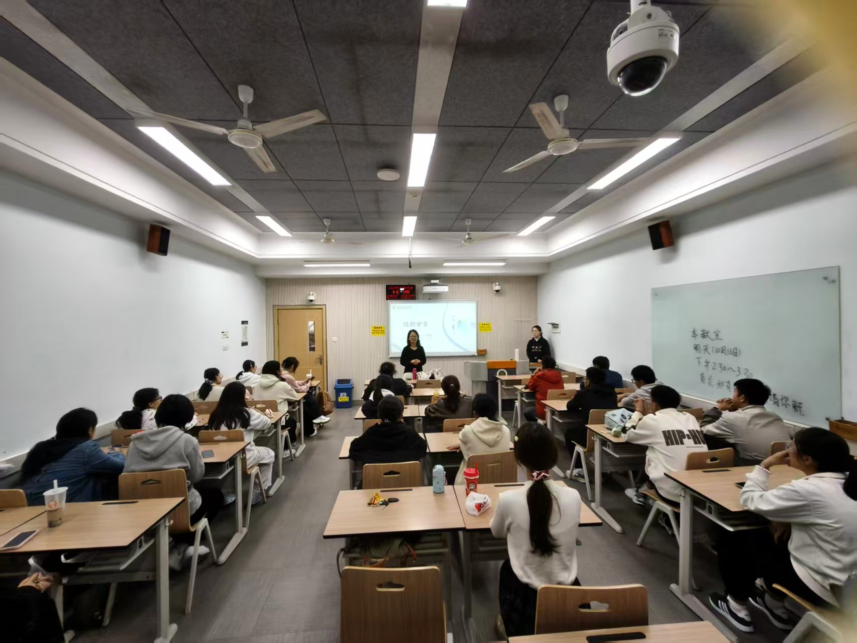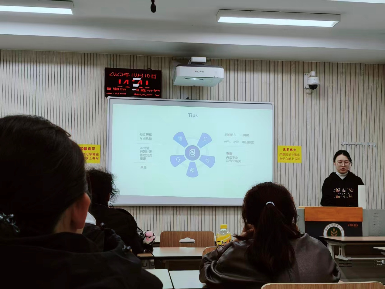 首先,班主任特邀英语23级优秀学姐刘怡萱,结合自身成长轨迹,从“专业学习”、“技能培养”和“目标规划”三大维度,为同学们带来一场干货满满的经验分享会。刘怡萱学姐围绕英语专业学习与技能提升,从课程体系、信息渠道、时间管理等方面细致拆解英语学习方法,强调实践对提升核心能力的关键作用;在技能培养上,她聚焦“听说读写”能力打磨与“输入输出”技能训练,指出专业素养与综合能力是同学们成长的“硬核武器”;同时,学姐结合大学四年成长周期,勾勒出清晰的生涯规划蓝图,为同学们提前锚定老员工涯的前行方向提供宝贵思路。