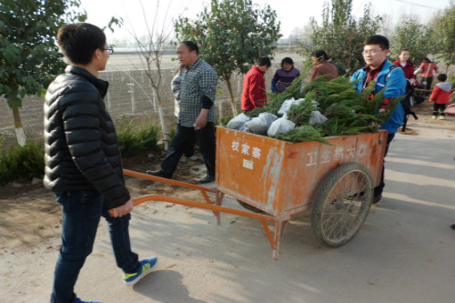 梁晓梅同学为科学地指导志愿者们进行树苗种植,在活动前特地就相关问题请教了林公司、植物保护公司的同学。活动中,志愿者们用手推车把树苗运送到植树地点,轻轻地取下保护树根的薄膜,在热心村民的帮助下,将一颗颗树苗放进道路两旁绿化带中已挖好的树坑里,回填土壤,整个过程有条不紊,秩序井然。经过两个小时的共同努力,本次植树活动圆满结束。志愿者周瑶说:“想要植树植的好,既要注意植株间距,又要保证回填土时树苗的直立性,想来如此简单,而做起来却需要加倍的努力和细心。”志愿者仲燕说:“活动中有不少村民参与进来,与我们这些志愿者共同协作、互帮互助、亲如一家,我们在弘扬了雷锋精神的同时也感受到了村民们的热情。”