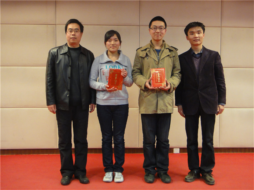 系党委副书记王小平(左一)、校团委社团管理部部长杨彦宝(右一)为二等奖获得队伍代表颁奖