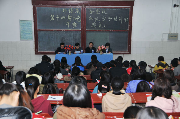 3月15日晚19:30,我系分党校第十四期入党积极分子培训班开班典礼在北校区4号楼4101教室举行。外语系党委书记、分党校董事长李安民,思政部主任方建斌,系党委副书记、分党校副董事长王小平及全体辅导员出席了本次典礼,培训班全体学员参加了开班典礼。典礼由外语系党务秘书路伟伟主持。
