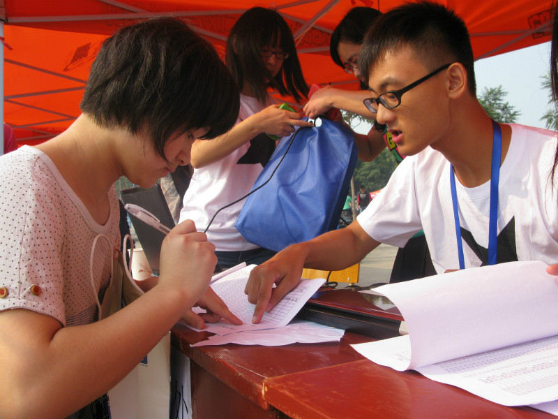 新生报到处包括资格审查、查验缴费单,注册登记,班级确认,分发一卡通、资料,入住宿舍等内容。为方便新生全面了解入学情况,我系特意将学科专业介绍、员工安全须知、辅导员及班主任电话、本科生新生报道流程等内容制作成宣传板,置于报到处前。本次迎新工作我系员工会干部采用轮班制,岗位、责任到人,秩序有条不紊。迎新工作每天将从上午7点半持续到晚上11点。
