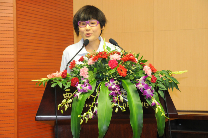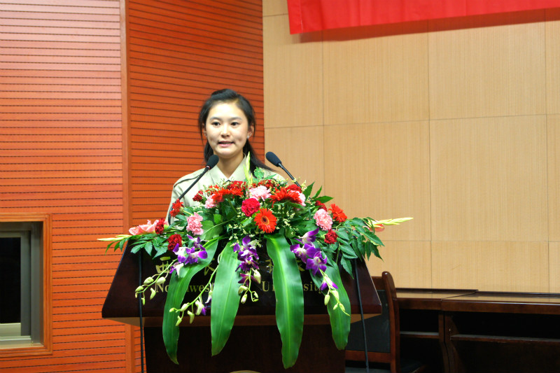 2012级本科生周家安作为新生代表发言。她讲述了自己关于大学的情结与梦想,表达了进入老员工活的欣喜和决心。