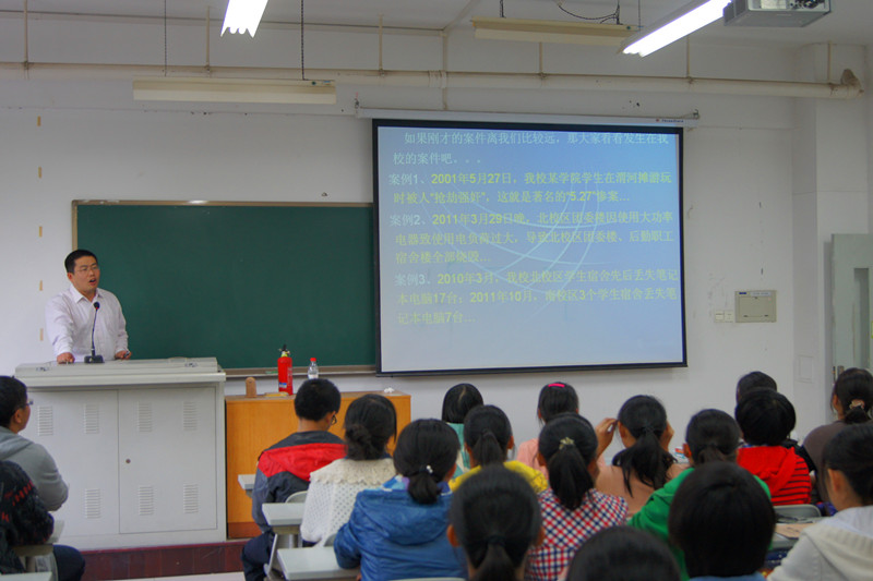 为了提高新生安全防范意识,预防安全事故的发生,10月10日下午两点,校保卫处秘书孙军老师在N8410为我系2012级全体新生做了主题为安全教育的报告会。
