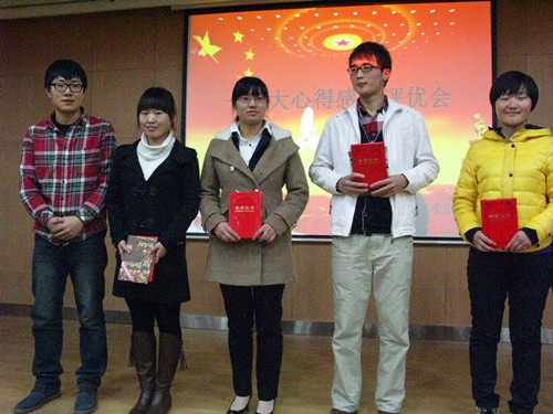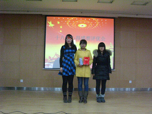 11月25日下午4:30,我系在北校绣山活动中心北报告厅举办了主题为“学习十八大心得感想评优会”的大型团组织生活。团工委书记曹姬倩蕊老师及系主席团全体干部出席了本次评优会,2011级、2012级员工代表参加了本次活动。