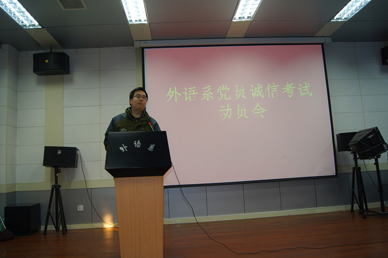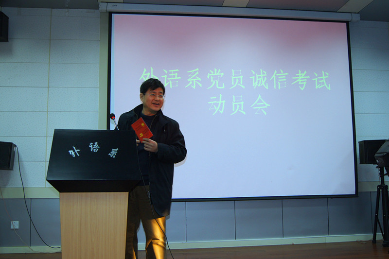 为进一步加强员工考风考纪教育,发挥员工党员在期末复考试中的先锋模范作用,1月9日下午,外语系在7501召开以“党员亮牌,诚信考试”为主题的全体员工党员大会,系党委书记李安民出席大会讲话,系党委副书记王小平主持大会,全体员工党员参加。