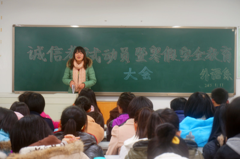 期末考试即将来临,外语系于1月17日晚在N8310教室召开诚信考试动员暨寒假安全教育大会。辅导员曹姬倩蕊老师,2012级全体员工出席了本次大会。