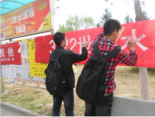 3月22日中午,我系携葡酒、植保、生科、食品公司的众多志愿者在西超雕塑前举办“节水、爱水、惜水从我做起”宣传签字活动。