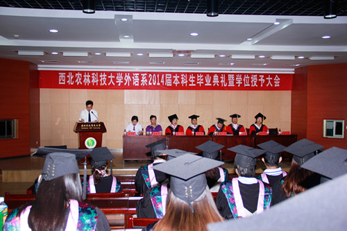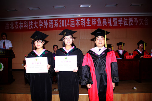 毕业典礼在庄严的国歌声中拉开帷幕。外语系副主任殷延军副教授首先宣读了《外语系关于授予2014届毕业生文学学士学位的决议》和校级优秀毕业论文获得者名单,系党委副书记王小平宣读了校级优秀毕业生及员工联络员名单。随后,系党委书记李安民为优秀毕业生颁发了证书;系主任杨宏教授为优秀论文获得者颁发了荣誉证书,并为员工联络员颁发了聘书;毕业生还向我系两名“我最喜爱的老师”的教师献花。