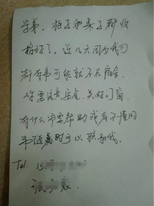 新生英语154班的彭宗臣说道:“我是提前到校的,当我一个人从陌生的杨凌火车站出站时天色已晚,与辅导员取得联系后,很快就有两名学长过来接我了,帮我提行李,一路上还跟我讲公司的各种趣事,让我觉得这个公司好有爱。到校后,原本以为很冷清的宿舍却被收拾得干干净净,布置得非常温馨。我的桌上还贴了一张小纸条,告诉我同宿的学长们因为有事暂时回不来,让我自己一个人在宿舍注意安全,听从老师和学长学姐们的安排。原本以为和学长混宿会有一些距离感,但这张纸条一下子就拉近了我们的距离,让我觉得这个家好温暖。”