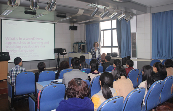 Jeanine Treffers-Daller教授以“The advantages of being bilingual or multilingual”和“New approaches to learning and teaching vocabulary in a foreign language”为主题分别与外语系师生进行座谈及学术交流。报告中她以二语习得语法和词汇孰轻孰重为切入点,提出词汇教学中方法策略的选择问题,特别强调了词汇教学要想方设法增加员工的参与度。同时,针对当下外语教学所关心的热点问题与广大师生展开了热烈讨论,鼓励大家积极探索词汇教学新方法,提高词汇教学的效率。