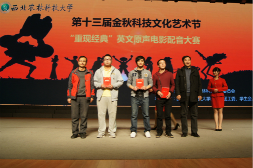 通过初赛和复赛的层层选拔,来自外语、动医、资环、农学、林学、动科、人文、经管、水建等多个院系的13支队伍从初赛80支队伍中脱颖而出,冲出复赛,挺进决赛。赛场上,选手们充分发挥了他们的创造才能和表演天赋,上演了一幕幕精彩而又别具特色的英文配音表演,博得了现场观众的热烈掌声和阵阵喝彩。由林公司傅华莉等同学带来的《精灵旅社》让观众在奇幻的精灵世界寻找到了别样生活的欢乐;由外语、动科、人文公司邢雨彤等同学联合出演的《卑鄙的我》让观众在语言的世界体会到了人性的温暖和温情;由外语系马思文等同学带来的《冰河世纪:猛犸圣诞节》更是配合钢琴、风琴、军鼓等多种乐器,在全消音的情况下为观众们带来一场视觉和听觉的圣诞狂欢……选手们的精彩表现、亲友团的欢呼打气以及本年度“校园十佳歌手”田依依的亲情献唱、曲艺团相声队成员的友情演绎,使得全场气氛十分活跃,欢呼不断。