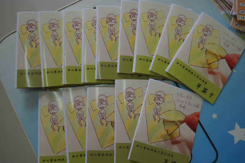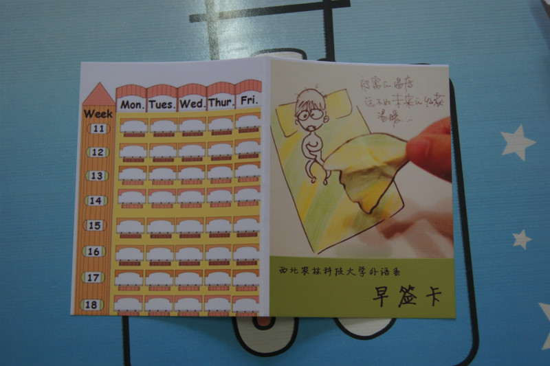 本次采用的早签卡设计一改往日中规中矩的风格,以“活泼、实用、贴近生活”为主调,达到让同学们“快乐早起,快乐早签”的设计目的。早签卡正面“被窝的温度,远不如未来的收获温暖”配上生动可爱的人物公仔,使整张卡面显得轻松而又发人深省。