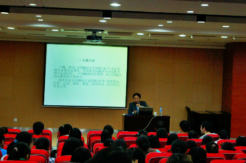 报告会一开始,卢敏先生首先介绍了中国翻译行业的现状和问题。他指出,翻译市场目前尚处于起步阶段,有发展速度快的优势。针对目前的翻译市场分析了翻译教学国际化,市场化,改革创新等解决措施。紧接着,卢老师为同学们具体介绍了职业翻译人才的标准,指出了笔译和口译的特点与要求。重点讲解了培养复合型职业翻译要求及怎样提高翻译实践能力,鼓励同学们要开阔视野,拓宽知识面,以科学的方法和执著的钻研精神,努力成为适应国家经济、文化、社会建设需要的高层次、应用型、专业性口笔译人才。最后,田志强副主任用英文总结了本次大会,对卢敏先生的报告总结为四个“I”(interesting, informative, instructive and innovative),他鼓励同学们要努力学习专业知识,锐意进取,形成良好的学习氛围,共同进步。