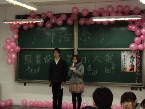 2011年3月25日晚7:30,在3号楼4层,由外语系女工部组织策划的针对大一全体员工的服装设计展示大赛隆重举行。本次活动到场的嘉宾有外语系团工委书记刘刚进老师,员工会主席王佳阳,副主席董斐,校学习副部长张学冶;评委分别是王勉堂老师、闫仙慧老师、田静老师、校宣传部郭鑫、摄影协会郭赞。
