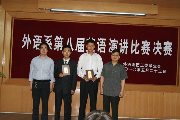 本次比赛以 “To serve not to be served” 为主题,比赛分为初赛和决赛两个阶段,参赛选手经过激烈角逐,最后有16名选手进入决赛。决赛分三个环节:命题演讲、即兴演讲和问答。进入决赛的16名员工,用流利的英文阐述了他们的观点。他们以标准的发音、适当的语速、饱满的感情、丰富的表情,给观众带来了听觉和视觉上的享受,赢得了现场热烈的掌声。本次比赛共评出一等奖1名,二等奖2名,三等奖3名,优秀奖10名,优秀组织奖1名。最后,英语专业08级1班范文杰同学以精彩的表现获得一等奖;英语专业08级4班张龙龙、07级2班张含兵同学获得二等奖;英语专业08级2班孙青、陈佩鸽、09级3班李首男同学获得三等奖;英语专业08级2班获得优秀组织奖。出席比赛的领导、嘉宾和评委为获奖选手颁发了获奖证书和奖品。