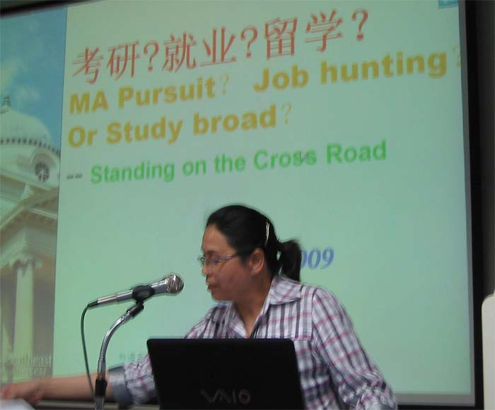 4月13日晚7:30,我系李丽霞教授在7501教室举行了“考研、就业、留学”的专题讲座,06级英语专业的全体同学参加了讲座。