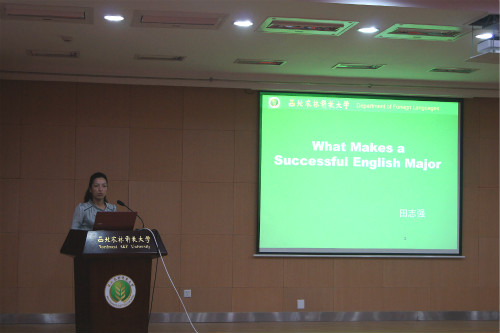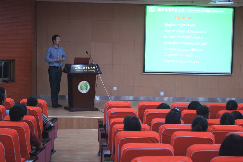 田志强老师长期从事英语教学、汉英翻译等工作。多年来,为公司及杨凌示范区和驻区企业的翻译工作做出来巨大贡献,涉及国际会议口译、招商引资、项目推介、世行项目、学术论文等方面。在大家的热烈欢迎下,田老师从Englishmajor at A&F, English major of the country, Behind the rapid increase,Difficulties of learning English, Real-life Success Stories, Qualities needed for you,English program for you七个方面为大家做了深入细致的讲解。首先,田老师从我系英语专业的现状出发,由小到大阐述了英语专业在全国高校的发展现状和趋势,让新生们对自己的公司、自身专业有了一个宏观的了解。紧接着,田老师就英语学习的难点做了详细的阐述,并通过一个个生动的例子向大家传授了攻破各个难点的方法和技巧。然后田老师介绍了我系员工的培养计划,并鼓励员工们培养自身优秀的品质习惯。田老师深刻的见解、风趣的语言、深入浅出的演讲引起了新生们的阵阵掌声,激发了员工们投入英语学习中去的热情,整场报告会气氛热烈。