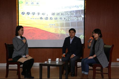 为更好地促进我系优良学风建设,增强我系学子凝聚力和荣誉感,解决员工学习发展中的困惑,12月4日晚,我系邀请到了外语系优秀员工范洪军和胡晨浔为全系学子做访谈。此次访谈会由2013级员工王金璐主持,外语系党委副书记滕艳萍、团工委书记张琦、2015级辅导员刘方及外语系全体员工参与了本次访谈会。