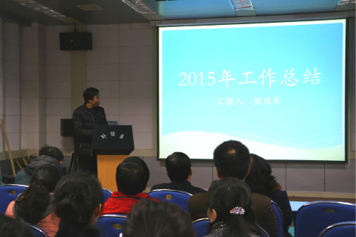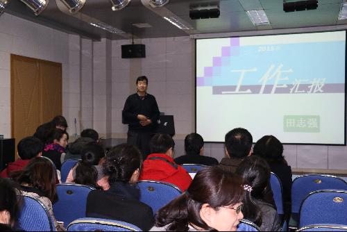 系主任杨宏首先从教学、科研、财务等方面进行了全面总结,重点有外语系改建两间研讨室,学术交流厅和多功能报告厅也即将投入使用;科研文章实现SSCI零突破,电子见刊SSCI论文1篇, C刊论文3篇, 2项软件著作权;为全体教师更换电脑。一年来,外语系也取得了一些成绩,招生宣传荣获全校第三名、新媒体平台荣获特色活动奖、职工运动会荣获团体第五名。在2016年进一步努力争取在人才引进及英语专业特色建设方面取得更大突破。