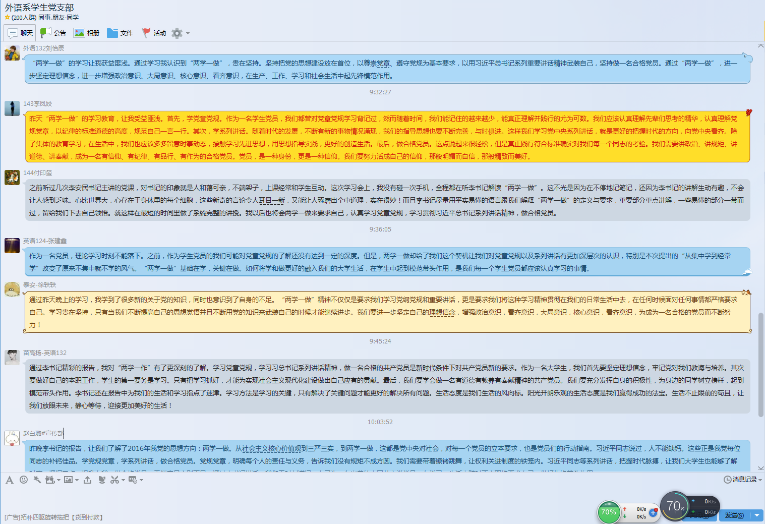 创新形式,引领新常态。在“两学一做”学习教育中,为发挥员工党员先锋模范作用,外语系党委创新学习教育形式,取得实效。为全体员工党员发放了包含《中国共产党章程》、《中国共产党廉洁自律准则》、《中国共产党纪律处分条例》等内容的党员学习手册和“两学一做”学习教育笔记本,促进学习工作落到实处;为每位员工党员配发党徽、在宿舍门贴上张贴共产党员标识,让员工党员“亮明身份”,时刻严格要求自己,争当党章党规、习近平总书记系列重要讲话的学习模范,做合格的党员,使学习教育抓在日常、严在经常;此外,创建员工党支部QQ群、微信群,充分发挥官方微信“西农魅力外语”、官方微博“365英国上市公司集团外语系”新媒体平台的优势,热烈地开展线上讨论,全方位、及时展示学习动态,营造了良好的学习氛围。