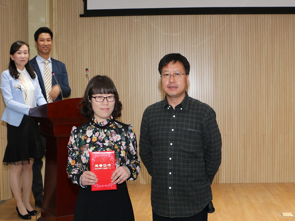 外语系主任杨宏为“最佳人气奖”获得者刘彩迎颁奖