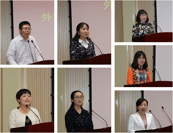 外语系副主任田志强、殷延军、系党委副书记滕艳萍为优秀奖获得者刘彩迎、王宝平、任娜、刘瑶、王旭、张鹏颁奖