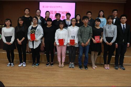 为丰富同学们的课余文化生活,营造良好的英语学习氛围,提供一个更广阔的英语实践平台,5月25日晚,由校团委、外语系主办的第三届外语文化艺术节之校园英文NEWS风采大赛在北绣山南报告厅活力开播。大赛邀请外语系教师王宝平、顾荣、闫仙慧、王保健、陈燕担任评委。外语系党委副书记滕艳萍,辅导员刘方、张琦出席此次比赛。