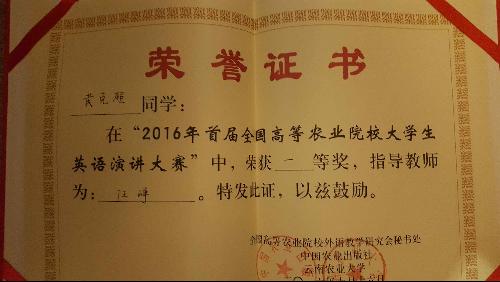 同时2016年首届全国高等农业院校老员工英语演讲大赛也于10月15日下午两点在云南农业大学拉开序幕。我系学子英语专业的黄克超同学以一篇精彩的演讲词,从自身体会娓娓道来,完美阐释了他对大会指定的演讲题目Man in nature, to chang or to be changed的理解。在即兴演讲和回答外教问题阶段,黄克超同学也充分体现出公司英语专业学子扎实基本功和机智的应变能力,他对人与自然之间的改造关系的观点得到了现场十九位评委的一致赞许。最后在参赛的16位选手的激烈争夺中,黄克超脱颖而出夺得第一名的好成绩。