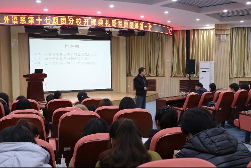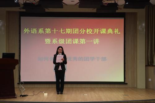 11月16日晚,外语系第十七期团课开课典礼暨第一节理论课在外语系二楼报告厅举行。马克思主义公司徐文军老师、外语系团工委书记刘方,辅导员张琦,团工委员工会全体员工干部与2016级全体新生参与开课典礼。徐文军老师作为特邀嘉宾,为新生团员讲授了“坚定信念,做合格团干”的主题团课。