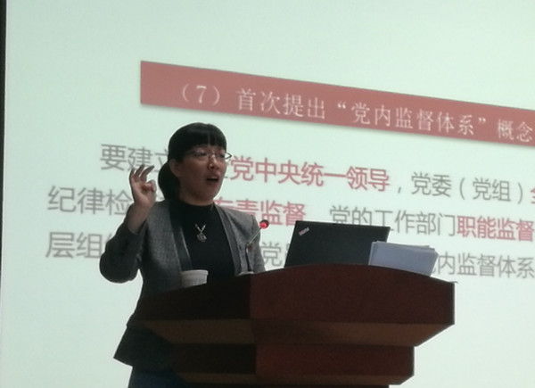 李娜从党的十八届六中全会召开的基本情况和重大意义、《关于新形势下党内政治生活的若干准则》夯实全面从严治党的基础、《中国共产党党内监督条例》提供全面从严治党的制度保障和坚决维护中央权威、牢固树立“四个意识”四个方面向全体党员做了宣讲。全体师生从中了解到党的十八届六中全会是完善“四个全面”战略布局、聚焦全面从严治党、凝聚全党思想共识和行动智慧、全面建成小康社会决胜阶段召开的重要会议。李娜还提及十八大以来历次全会主题,全面地介绍了一中全会至五中全会。之后她强调了党的十八届六中全会的基本精神和重要成果,展示了《关于新形势下党内政治生活的若干准则》的基本框架。她指出,党要管党,首先要从党内政治生活管起;从严治党,首先要从党内政治生活严起,这是我们党的优良传统和政治优势。严肃党内政治生活是全面从严治党的基础。与此同时,党内监督作为党的建设的重要内容,是全面从严治党的重要保证,党的执政地位,决定了党内监督在党和国家各种监督形式中是最基本的、第一位的。加强和规范党内政治生活、加强党内监督是全党的共同任务,必须全党一起努力。