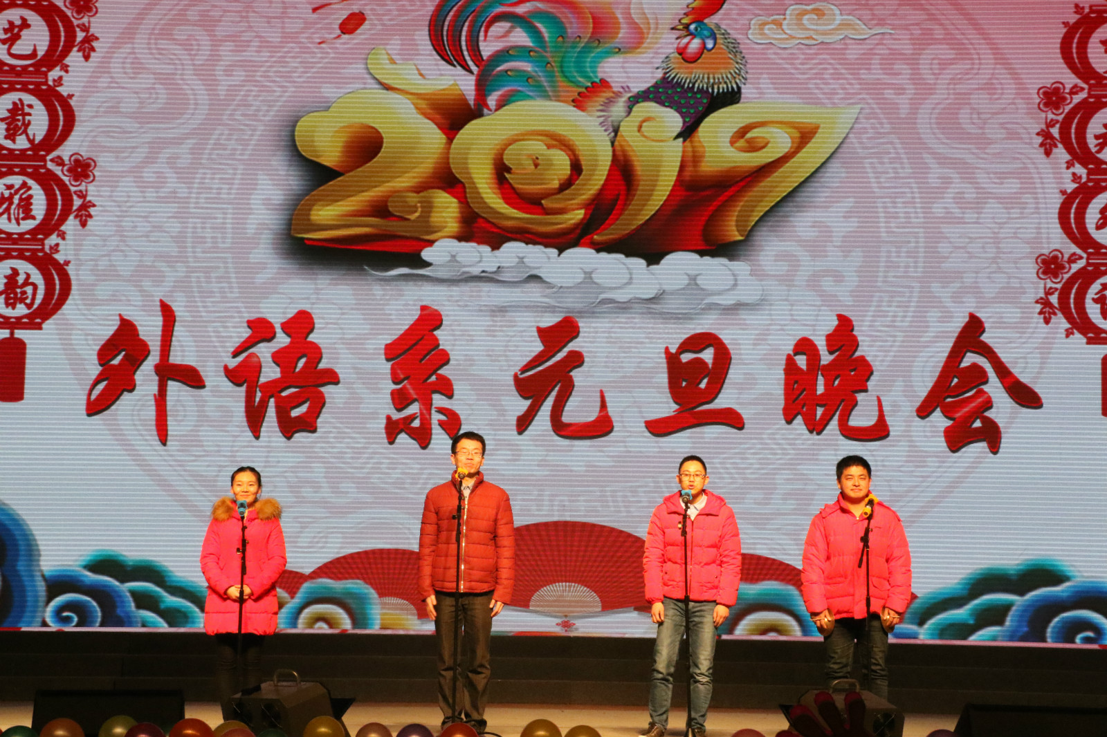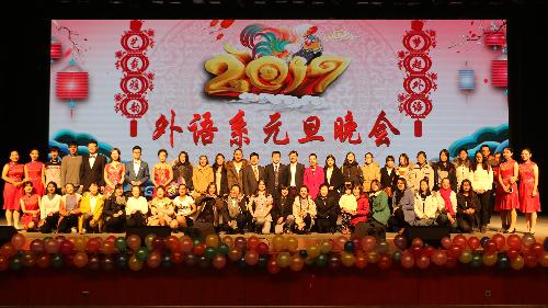 灵猴献瑞,金鸡报春。12月28日晚,外语系2015-2016年度表彰大会暨“艺载雅韵·梦起外语”2017年元旦晚会于北绣大厅成功举办。就业指导中心主任胥耀平,校团委副书记师燕妮,员工处副处长徐三友,外语系主任杨宏、党委书记李安民,副书记滕艳萍、外语系副主任殷延军、张凌等领导莅临现场。以及系部分教职工、班主任、辅导员、同学近六百人欢聚一堂,享受了一场饕鬄盛宴。