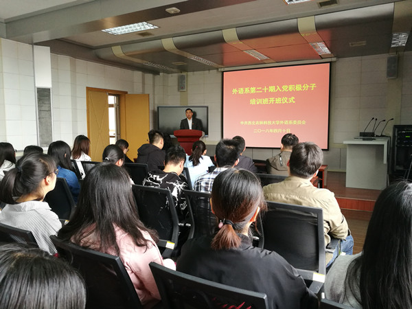 4月10日下午,外语系举行了第二十期入党积极分子培训班开班仪式。系党委书记、分党校董事长李万强,副书记、分党校副董事长滕艳萍,辅导员尹传松和全体学员参加了开班仪式。