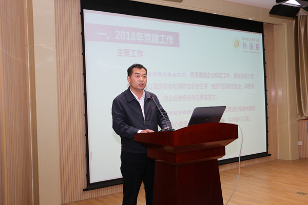 系党委书记李万强对外语系2018年党建工作做了安排部署,并对解放思想大讨论活动进行了动员讲话。他指出,2018年外语系党委要深入贯彻落实党的十九大精神,以习近平新时代中国特色社会主义思想为指导,坚持立德树人根本任务,落实全面从严治党主体责任,充分发挥系党委的政治核心作用,全面推进党的政治建设、思想建设、组织建设、作风建设、纪律建设,把制度建设贯穿其中,抓严反腐倡廉建设,为外语系事业发展和公司“双一流”建设提供坚强政治保证。李万强强调,全体教师要站在公司“双一流”建设的高度,深刻认识解放思想大讨论活动的重要意义,进一步摆脱思维定式,在解放思想中解决问题,在解决问题中解放思想。各教研室、党支部要做好大讨论的组织工作,坚持务实与务虚相结合,突出主题,把握重点,围绕实际组织开展讨论,防止走过场,杜绝形式主义,做到讨论有记录、有总结、有宣传,做到保证时间、人人参与、全员讨论,把解放思想大讨论与推进外语系发展结合起来,切实解决制约外语系发展的关键问题。