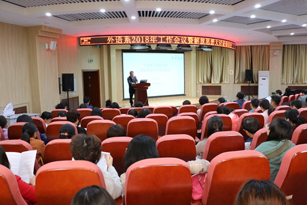 4月25日下午,外语系在七号楼二层报告厅召开2018年工作会议暨解放思想大讨论动员会,全系教职工参加了会议。副主任殷延军主持会议。