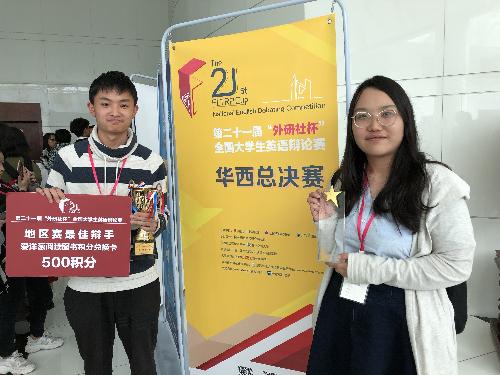 我系杨轩、刘悦妍两名学子在比赛中凭借流利的口语与敏捷的思辨能力脱颖而出,荣获华西赛区一等奖。其中,杨轩同学的语言表达、逻辑思辨、快速反应和渊博学识得到了赛事评委的广泛认可,从194名辩手中脱颖而出,被评为华西赛区“最佳辩手”。此外,公司也凭借在校选赛中的精心组织、有序安排获得赛事“优秀组织奖”,指导教师邓仁毅获“优秀指导老师”奖。