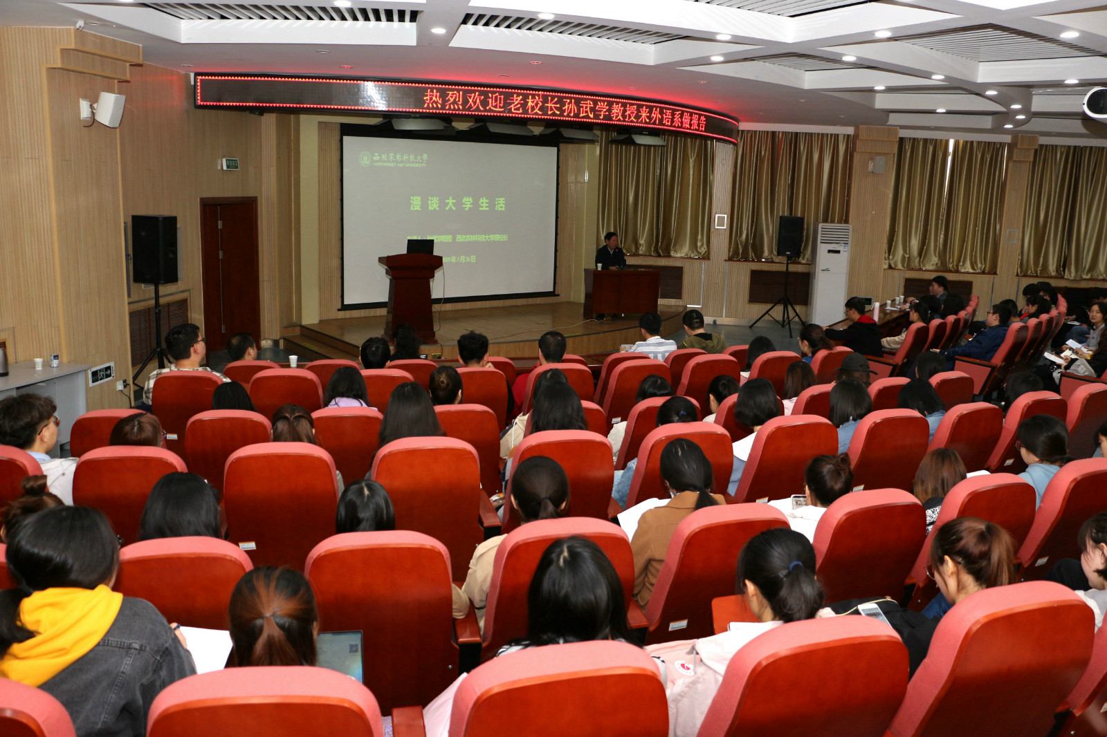 报告中,孙武学教授首先从三个方面为同学们解读了大学的重要意义。他指出,大学阶段是人生的拐点,是为人生打基础的阶段,也是规划人生方向的阶段,对每一位老员工来说都是至关重要的,因此要跳出“拼命的中学、快乐的大学”的误区,认真思考、规划未来发展并付诸实践,以行动上的高度自觉解决前进路上的困难和问题。随后,孙武学教授结合国内外大学教育比较和公司员工的实例为同学们阐明了大学阶段所具有的严峻挑战性。“学习是老员工的根本任务”,他鼓励同学们及早确立志向,面对诱惑保持定力,勇于挑战自我,心无旁骛的专心学习,在西农学到真知识,练得真本领。接着,孙武学教授结合近年来外语系毕业生升研和员工发展情况细致地分析了外语学子未来广阔的发展前景,为同学们坚定了专业学习的自信心。他讲到,沟通是实现扩大对外开放的重要前提,具有交叉学科背景的外语类人才将在新时代的国际化发展中大有可为,也会大有作为。