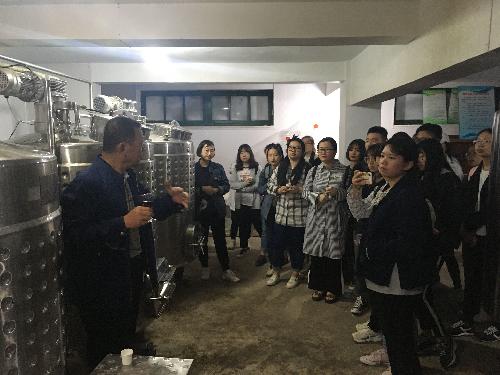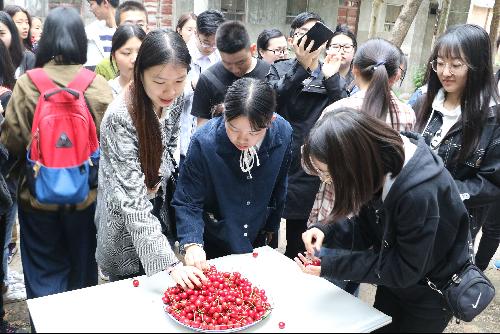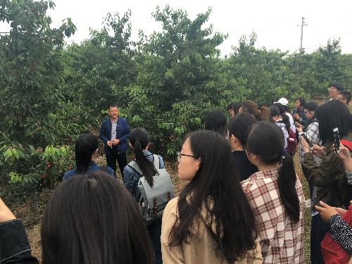 活动伊始,渭河樱桃试验示范站站长李平科向同学们简要介绍了试验站的科研、教学、示范推广情况以及樱桃的基本知识。他讲到,甜樱桃又称“车厘子”,此名称来源于英文名称“Cherry”的音译,其成熟时间早、外形美观、鲜艳亮泽、果实大、果肉多厚且柔软多汁、味道甜美、口感好,素有“水果中的钻石”之美誉,近年来在乡村产业振兴、脱贫攻坚和提升百姓生活水平中起到了重要的作用。随后,在李平科的带领下,同学们详细了解了试验站目前正在示范推广的樱桃纺锤形栽培模式、V字形栽培模式、多主干篱壁式栽培模式和主要栽培的甜樱桃品种。期间,李平科重点介绍了公司樱桃专家蔡宇良教授选育的甜樱桃早熟新品种“秦樱1号”、中熟优质品种“短枝艳阳”、晚熟耐贮运新品种“吉美”,鲜食、加工兼用酸樱桃品种“玫丽”“玫蕾”“奥德”和“奥杰”和抗根癌病、抗盐碱、抗矮化的砧木品种“马哈利CDR—1”的选育过程和品质特点。试验田中,一棵棵樱桃树绿叶舒展,串串樱桃压弯了枝头,同学们跟随老师的讲授仔细观察樱桃成熟性状、认真辨认各樱桃品种。接着,同学们品尝了试验站近期采收的中晚熟果实,边吃着脆甜无比的樱桃,边“品读”着公司农业科学家在大地上书写下的“文章”。最后,同学们参观了樱桃酒酿造车间,对利口酒、白兰地等樱桃果酒的生产工艺进行了认知学习。