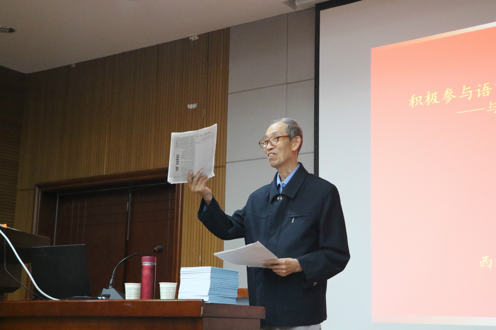 首先,黄世绶教授从自身经历出发向同学们讲述西农故事,传递西农精神。作为外语系的一名老教授,他一直以来都在关注着外语系的发展、年轻教师的成长,他向大家展示了近年来搜集到的系上各位老师相关报道,激励同学们要坚定自己的目标,奋发有为。随后,就英语学习中的四个误区,黄老师进行了详细的讲解,他提到,学习一门外语,应有“活到老,学到老”的思想准备,要把语言知识变成语言技能,唯一可靠的是下苦功夫,通过自己不懈的实践培养语言能力和交际能力。针对汉语国际教育这个新专业,黄教授提醒同学们要养成良好的学习习惯,努力培养跨文化交际的能力。