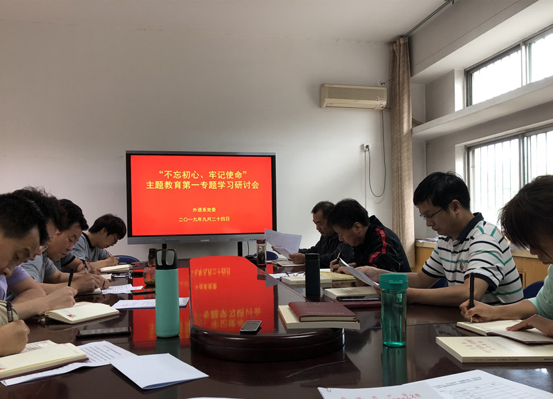 9月24日下午,外语系党委举行“不忘初心、牢记使命”主题教育第一次集中学习研讨会暨系党委中心组2019年第五次集体学习,围绕“加强党的政治建设”这一主题,开展集中学习研讨。系党委书记李万强主持学习研讨会。系党委中心组成员结合前期自学《中共中央关于加强党的政治建设的意见》情况,围绕“加强党的政治建设”主题,聚焦学习贯彻习近平总书记关于“不忘初心、牢记使命”的重要论述进行了交流研讨。系班子成员、党委委员、各支部书记参加学习。