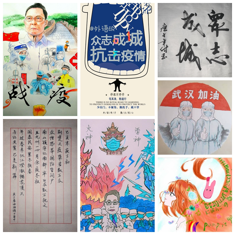 近日,外语系发起了外语学子齐心抗“疫”主题宣传作品征集活动,活动以“抗击疫情,我的‘宅’故事”为主题,得到了同学们的积极响应与热情参与,短时间内收集到投稿30余份。同学们用原创歌曲、宣传画、书法、手抄报、vlog、短视频等形式向奋战在疫情防控一线的工作人员致敬,为疫区送上美好祝愿,记录疫情期间的“阿宅”生活。