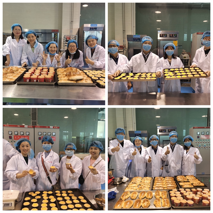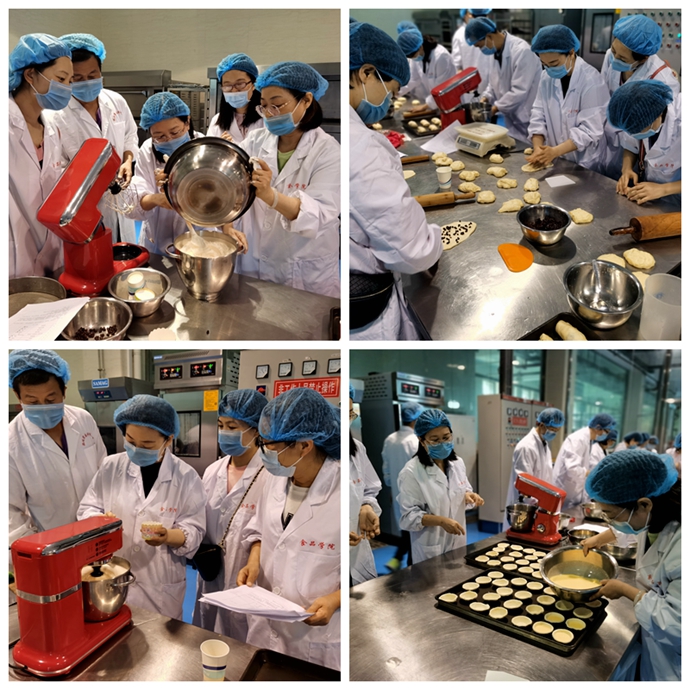 本次体验培训活动在食品公司焙烤间分5个小组同时进行,来自食品公司的3位老师从面包、蛋挞和蛋糕三种面点的制作过程、方法步骤和每个环节注意事项给老师们做了详细介绍。随后,各组成员在操作规范流程和面点师傅的悉心指导下,从和面、打蛋、搅拌等最基础的步骤开始,自己动手,亲身体验,热情高涨,气氛热烈。虽然教工们的动作还不娴熟规范,但是大家对生活积极乐观和对做事精益求精的态度却在烘焙制作中充分体现出来,经过小组成员的通力合作,一盘盘整齐划一、饱含新意的面点摆上烤盘,送入烤箱。