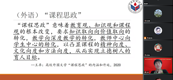 在《课程思政·专业思政·学科思政—人才培养目标视域下的课程思政》报告中,她谈到“课程思政”正处于深化和系统化的关键期,对于外语教育而言,由于内容特殊性、外语学科的跨学科属性和外语教育的合作参与性使得外语课程思政更具有特殊意义,提出课程思政、专业思政与学科思政之间的恰适性,人才培养目标、毕业要求、课程目标的恰适性,课程思政“三观”重构和课程思政的目标导向性和内容导向性四个观点,指出课程思政建设要以学科和专业特点为依据,凸显课程的精神向度、文化向度和方法向度,要重视教学理论和教学方法创新,做到知识教学到价值引领,实现立德树人育人目标。